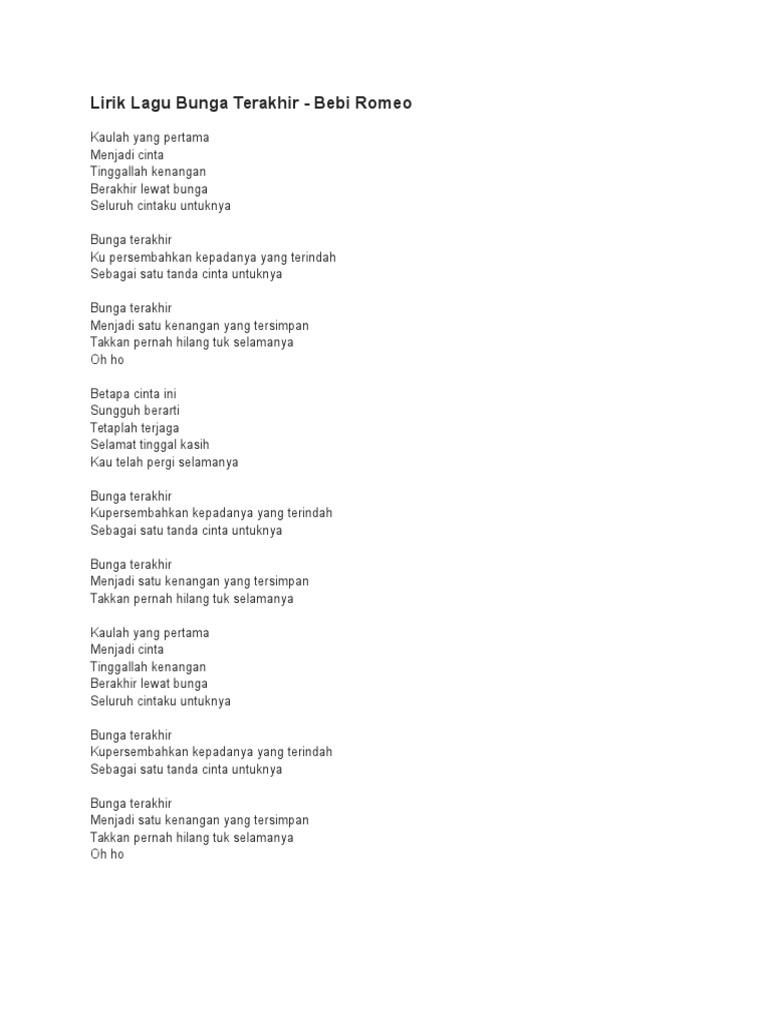 Lirik bunga terakhir oleh romeo. Reff :bunga terakhir.kupersembahkan kepada yang terindahsebagai satu tanda cinta untuknya bunga terakhir.menjadi satu kenangan yang tersimpantakkan pernah hilang 'tuk selamanya oh. Bersama romeo, bebi telah merilis 4 album hingga tahun 2006, yaitu romeo (1999), wanita (2002). Pada saat rilis di bawah label aquarius musikindo dalam soal chord lagu ini menggunakan chord progression yang agak sulit dimainkan. Play along with guitar, ukulele, or piano with interactive chords and diagrams.